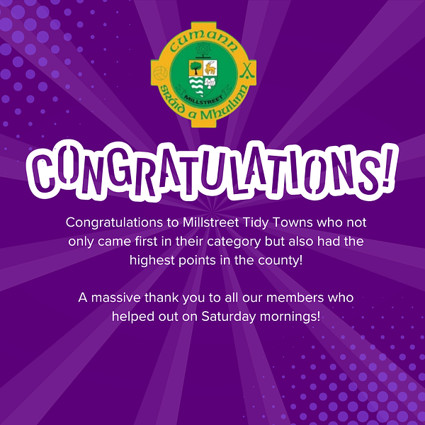 Congratulations to Millstreet Tidy Towns who won first prize this year. Thanks also to our members who helped with the clean up on Saturday mornings.