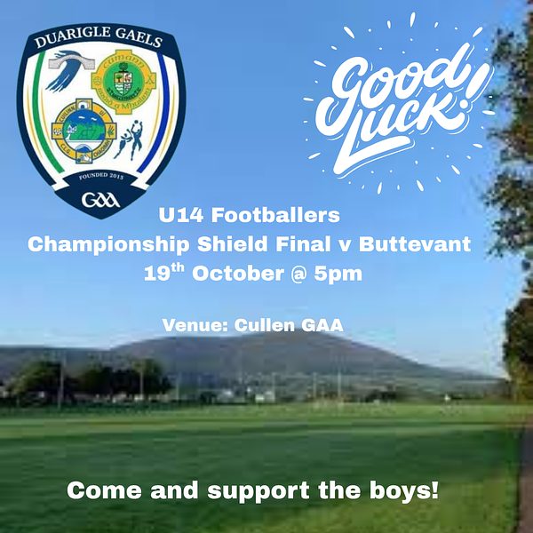 Wishing the U14 footballers and their coaches the very best of luck as they take on Buttevant in the shield final.