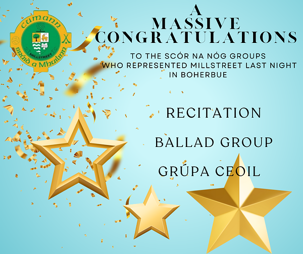 A massive congrats to all who represented Millstreet in Scór na nÓg in Boherbue last night. A great night was had with great results too!