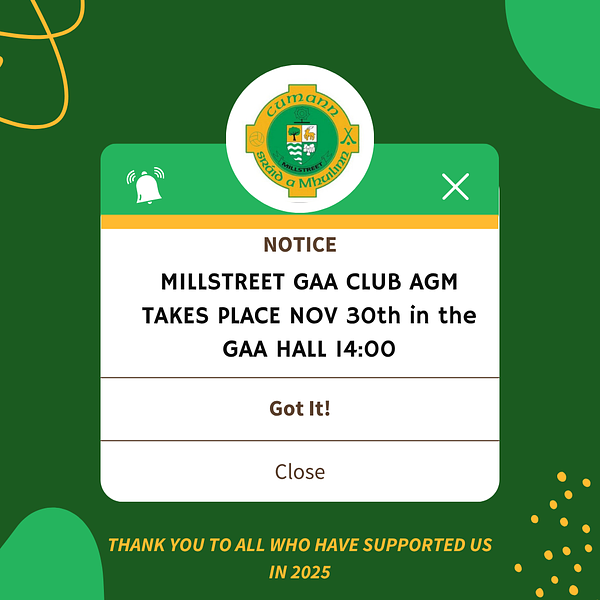 Our Annual General Meeting will take place on Sunday, 30th November at 2:00pm in the GAA Hall.
