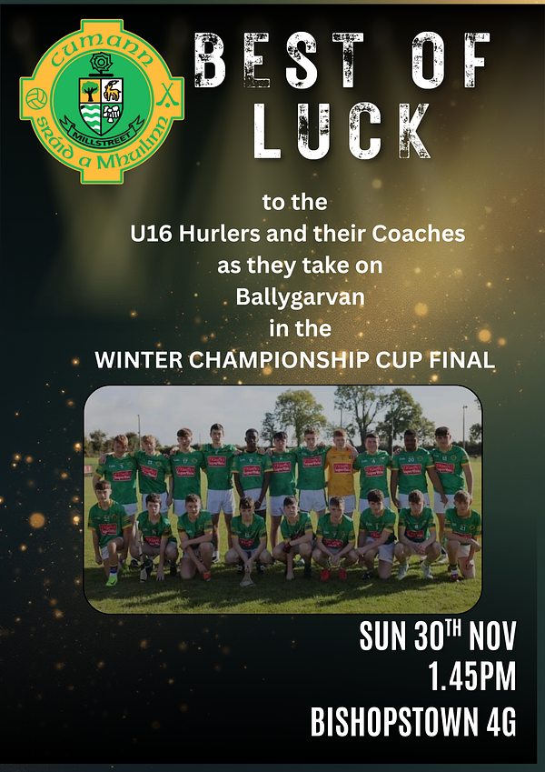 The very best of luck to our U16 Hurlers and their Coaches as they compete in the Winter Championship Final against Ballygarvan.