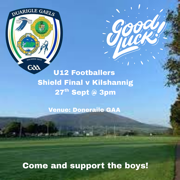 Wishing all the U12 football team and their coaches the very best of luck as they take on Kilshanning in the Shield Final tomorrow in Doneraile.