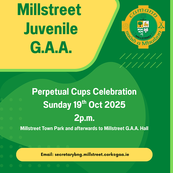 Our annual Perpetual Cups Celebration will take place on Sunday 19th October at 2pm. All are invited to Millstreet Town Park to watch the matches and afterwards to the hall where the Perpetual Cups and Shield will be presented and refreshments will be served.